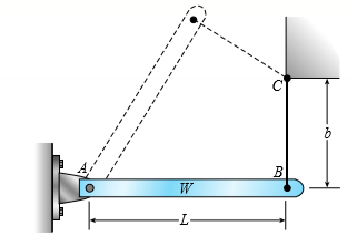 A rigid bar AB having a mass M = 1.0 kg and length L = 0.5 m is hinged at end A and supported at end B by a nylon cord BC (see figure). The cord has cross-sectional area A = 30 mm2, length b = 0.25 m, and modulus of elasticity E = 2.1 GPa.