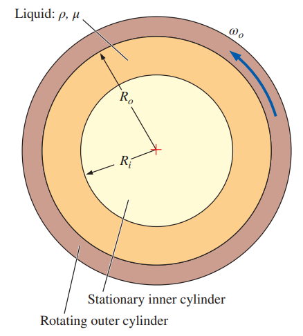 A rotating viscometer consists of two concentric cylindersâa stationary inner cylinder of radius Ri and an outer cylinder of inside radius Ro rotating at angular velocity (rotation rate) Ïo. In the tiny gap between the two cylinders is the fluid whose viscosity (μ) is to be measured. The length of the cylinders (into the page in Fig. P10â31) is L. L is large such that end effects are negligible (we can treat this as a two dimensional problem). Torque (T) is required to rotate the inner cylinder at constant speed. Showing all your work and algebra, generate an approximate expression of T as a function of the other variables.