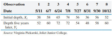 A Secchi disk is an 8-inch-diameter weighted disk that is painted black and white and attached to a rope. The disk is lowered into water and the depth (in inches) at which it is no longer visible is recorded. The measurement is an indication of water clarity. An environmental biologist interested in determining whether the water clarity of the lake at Joliet Junior College is improving takes measurements at the same location on eight dates during the course of a year and repeats the measurements on the same dates five years later. She obtains the following results: