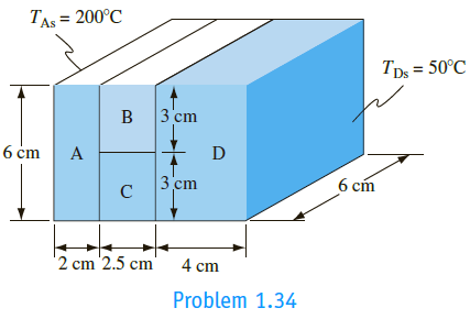 A section of a composite wall with the dimensions shown below has uniform temperatures of 200°C and 50°C over the left and right surfaces, respectively. If the thermal conductivities of the wall materials are: kA = 70 W/m K, kB = 60 W/m K, kC = 40 W/m K, and kD = 20 W/m K, determine the rate of heat transfer through this section of the wall and the temperatures at the interfaces.