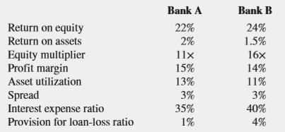 Bank A Bank B Return on equity 22% 24% Return on assets 2% 1.5% 11x equity Multiplier Profit margin 16x 15% 14% 13% 3% 35% asset utilization 11% Spread Interest expense ratio 3% 40% 4% Provision for loan-loss ratio 1%