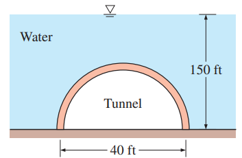 A semicircular 40-ft-diameter tunnel is to be built under a 150-ft-deep, 800-ft-long lake, as shown in Fig. P11â45E. Determine the total hydrostatic force acting on the roof of the tunnel.