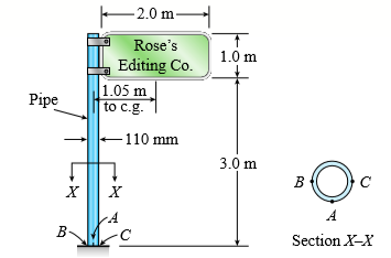 A sign is supported by a pipe (see figure) having an outer diameter 110 mm and inner diameter 90 mm. The dimensions of the sign are 2.0 m à 1.0 m, and its lower edge is 3.0 m above the base. Note that the center of gravity of the sign is 1.05 m from the axis of the pipe. The wind pressure against the sign is 1.5 kPa.