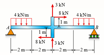 3 kN 8 kN 4 kN/m 4 kN/m 1 m A B 1m 8 kN 3 kN -2 m- -2 m -2 m– -2 m