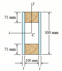 What is the required thickness t of the steel plates if the allowable stresses are 120 MPa for the steel and 6.5Â MPa for the wood? (Assume that the moduli of elasticity for the steel and wood are 210 GPa and 10 GPa, respectively, and disregard the weight of the beam.)