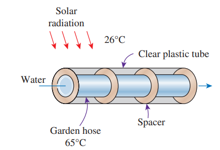 A simple solar collector is built by placing a 5-cm diameter clear plastic tube around a garden hose whose outer diameter is 1.6 cm. The hose is painted black to maximize solar absorption, and some plastic rings are used to keep the spacing between the hose and the clear plastic cover constant. During a clear day, the temperature of the hose is measured to be 65°C, while the ambient air temperature is 26°C. Determine the rate of heat loss from the water in the hose per meter of its length by natural convection. Also, discuss how the performance of this solar collector can be improved. Evaluate air properties at an average temperature of 50°C and 1 atm pressure. Is this a good assumption?