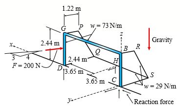 A soccer goal is subjected to gravity loads (in the 2z direction, w = 73 N/m for DG, BG, and BC; w = 29 N/m for all other members; see figure) and a force F = 200 N applied eccentrically at the mid-height of member DG. Find reactions at supports C, D, and H.