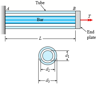 A solid steel bar of diameter d1 = 25.0mm is enclosed by a steel tube of outer diameter d3 = 37.5 mm and inner diameter d2 = 30.0mm (see figure). Both bar and tube are held rigidly by a support at end A and joined securely to a rigid plate at end B. The composite bar, which has a length L = 550 mm, is twisted by a torque T = 400 Nm? acting on the end plate.