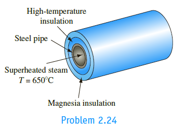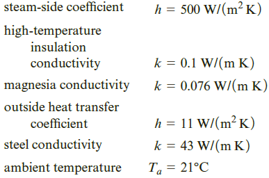 A standard 10-cm steel pipe (ID = 10.066 cm, OD = 11.25 cm) carries superheated steam at 650oC in an enclosed space where a fire hazard exists, limiting the outer surface temperature to 38oC. To minimize the insulation cost, two materials are to be used: first a high-temperature (relatively expensive) insulation is to be applied to the pipe, and then magnesia (a less expensive material) will be applied on the outside. The maximum temperature of the magnesia is to be 315oC. The following constants (see next page) are known: