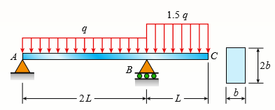A steel beam ABC is simply supported at A and B and has an overhang BC of length L = 150 mm (see figure). The beam supports a uniform load of intensity q = 4.0 kN/m over its entire span AB and 1.5q over BC. The cross section of the beam is rectangular with width b and height 2b. The allowable bending stress in the steel is Ïallow = 60 MPa, and its weight density is γ = 77.0kN/m3.