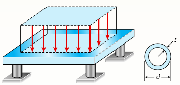 A steel pad supporting heavy machinery rests on four short, hollow, cast iron piers (see figure). The ultimate strength of the cast iron in compression is 400 MPa. The total load P that may be supported by the pad is 900 kN. Using a factor of safety 3.0 with respect to ultimate strength, determine the outer diameter of the pier if the thickness is of the cross section is 12 mm.