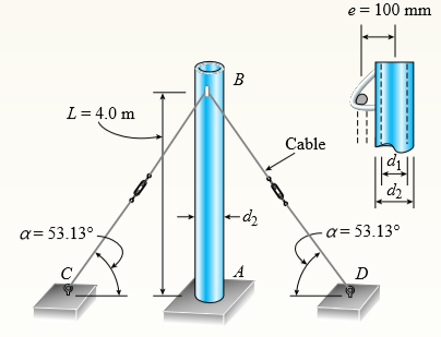 > A vertical post AB is embedded in a concrete foundation and held at the top by two cables (see figure). The post is a hollow steel tube with modulus of elasticity 200 GPa, outer diameter of 40 mm, and thickness of 5 mm. The cables are tightened equally b