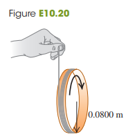 A string is wrapped several times around the rim of a small hoop with radius 8.00 cm and mass 0.180 kg. The free end of the string is held in place and the hoop is released from rest (Fig. E10.20). After the hoop has descended 75.0 cm, calculate
