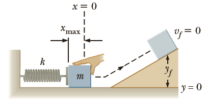A student pushes the 1.50 - kg block in Figure P13.11 against a horizontal spring, compressing it by 0.125 m. When released, the block travels across a horizontal surface and up an incline. Neglecting friction, find the blockâs maximum height if the spring constant is k = 575 N/m.