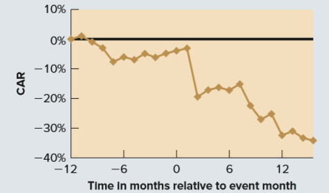 A study analyzed the behavior of the stock prices of firms that had lost antitrust cases. Included in the diagram are all firms that lost the initial court decision, even if the decision was later overturned on appeal. The event at time 0 is the initial, pre-appeal court decision. Assume no other information was released, aside from that disclosed in the initial trial. The stock prices all have a beta of 1. Is the diagram consistent with market efficiency? Why or why not?