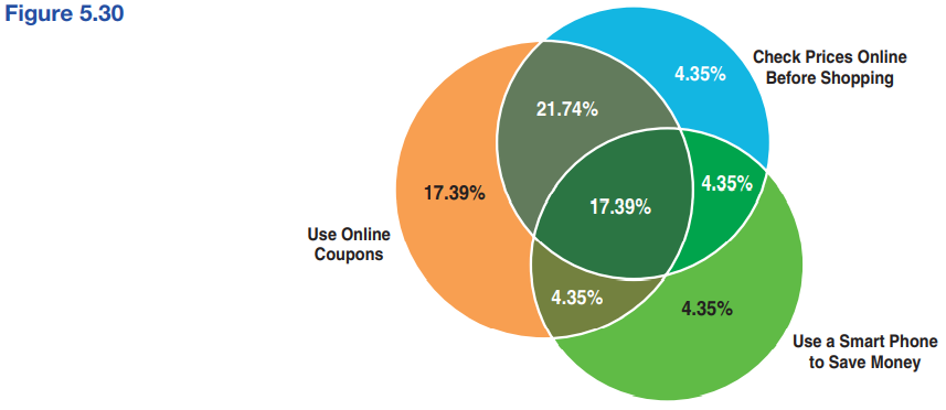 A survey of shopping habits found the percentage of respondents that use technology for shopping as shown in Figure 5.30. For example, 17.39% only use online coupons; 21.74% use online coupons and check prices online before shopping, and so on.