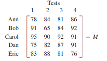A teacher has given four tests to a class of five students and stored the results in the following matrix: