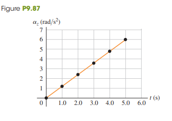 A technician is testing a computer-controlled, variable-speed motor. She attaches a thin disk to the motor shaft, with the shaft at the center of the disk. The disk starts from rest, and sensors attached to the motor shaft measure the angular acceleration az of the shaft as a function of time. The results from one test run are shown in Fig. P9.87:
