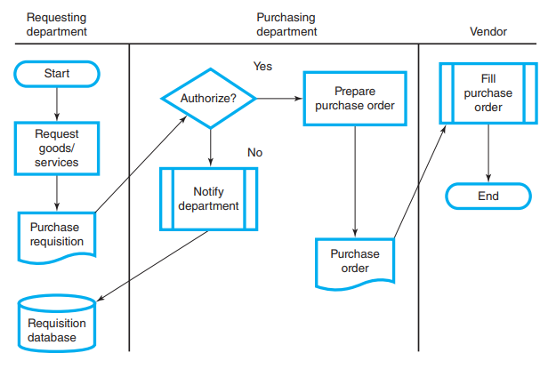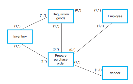Requesting department Purchasing department Vendor Yes Start Fill purchase Prepare purchase order Authorize? order Request goods/ services No Notify department End Purchase requisition Purchase order Requisition database Requesting department Vendor Requisition data External p.o. data 1.0 Prepare purchase order Internal p.o. data P.O. database | (0,") (1,1) Requisition goods (1,*) Employee (1,") (1,*) (1,1) Inventory (1,*) (0,") (0,") Prepare purchase order (1,") |(1,") (1,1) Vendor