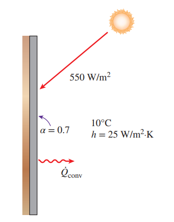 A thin metal plate is insulated on the back and exposed to solar radiation on the front surface. The exposed surface of the plate has an absorptivity of 0.7 for solar radiation. If solar radiation is incident on the plate at a rate of 550 W/m2 and the surrounding air temperature is 10°C, determine the surface temperature of the plate when the heat loss by convection equals the solar energy absorbed by the plate. Take the convection heat transfer coefficient to be 25 W/m2â