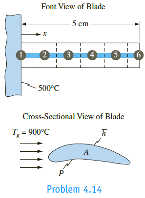 A turbine blade 5 cm long with a cross-sectional area A = 4.5 cm2 and a perimeter P = 12 cm is made of a high-alloy steel (k = 25 W/m K) . The temperature of the blade attachment point is 500°C, and the blade is exposed to combustion gases at 900°C. The heat transfer coefficient between the blade surface and the combustion gases is 500 W/m2 K. Using the nodal network shown in the accompanying sketch,