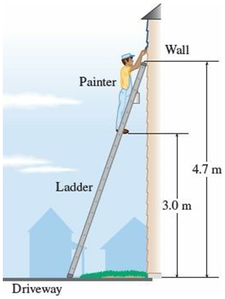 > A house painter stands 3.0 m above the ground on a 5.0 m long ladder that leans against the wall at a point 4.7 m above the ground. The painter weighs 680 N and the ladder weighs 120 N. Assuming no friction between the house and the upper end of the ladd