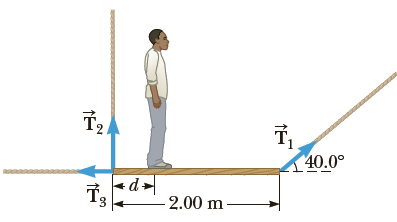 A uniform plank of length 2.00 m and mass 30.0 kg is supported by three ropes, as indicated by the blue vectors in Figure P8.27. Find the tension in each rope when a 700.-N person is d = 0.500 m from the left end.