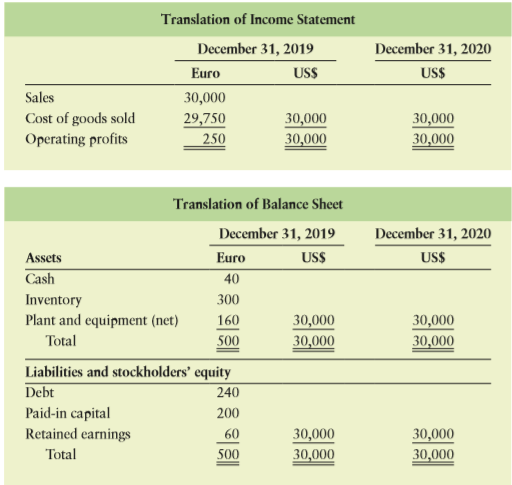 Translation of Income Statement December 31, 2019 December 31, 2020 Euro USS US$ Sales 30,000 Cost of goods sold Operating profits 29,750 250 30,000 30,000 30,000 30,000 Translation of Balance Sheet December 31, 2019 December 31, 2020 Assets Euro USS US$ Cash 40 Inventory Plant and equipment (net) 300 160 500 30,000 30,000 30,000 Total 30,000 Liabilities and stockholders' equity Debt 240 Paid-in capital Retained earnings 200 30,000 30,000 30,000 30,000 60 Total 500