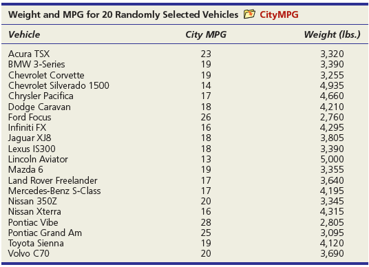 Weight and MPG for 20 Randomly Selected Vehicles CityMPG Vehicle City MPG Weight (Ibs.) Acura TSX BMW 3-Series Chevrolet Corvette Chevrolet Silverado 1500 23 19 3,320 3,390 3,255 4,935 4,660 4,210 2,760 4,295 3,805 3,390 5,000 3,355 3,640 4,195 3,345 4,315 2,805 3,095 4,120 3,690 19 14 17 Chrysler Pacifica Dodge Caravan Ford Focus Infiniti FX Jaguar XJ8 Lexus IS300 Lincoln Aviator Mazda 6 Land Rover Freelander Mercedes-Benz S-Class 18 26 16 18 18 13 19 17 17 20 16 Nissan 350Z Nissan Xterra Pontiac Vibe Pontiac Grand Am Toyota Sienna 28 25 19 20 Volvo C70