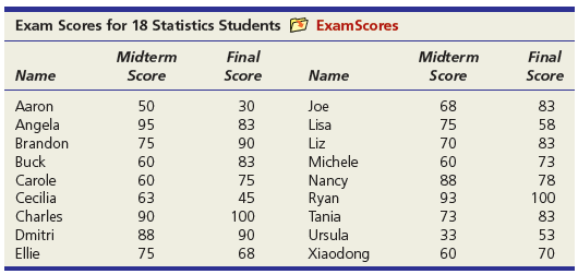 Exam Scores for 18 Statistics Students ExamScores Midterm Final Midterm Final Name Score Score Name Score Score Aaron 50 30 Joe 68 83 Angela Brandon 95 83 Lisa 75 58 75 90 Liz 70 83 Buck Carole Cecilia 60 83 Michele 60 73 60 75 Nancy Ryan 88 78 63 45 93 100 Charles 90 100 Tania 73 83 Dmitri 88 90 Ursula 33 53 Ellie 75 68 Xiaodong 60 70