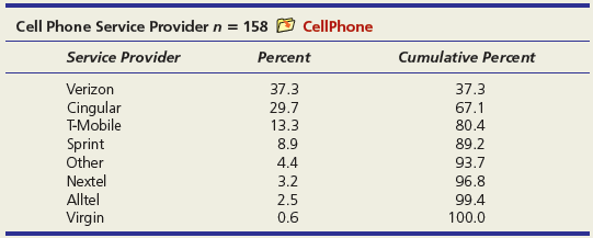 Cell Phone Service Provider n = 158 O CellPhone Service Provider Percent Cumulative Percent Verizon 37.3 37.3 Cingular T-Mobile 29.7 67.1 13.3 80.4 Sprint Other 8.9 89.2 4.4 93.7 Nextel 3.2 96.8 Alltel Virgin 2.5 99.4 0.6 100.0