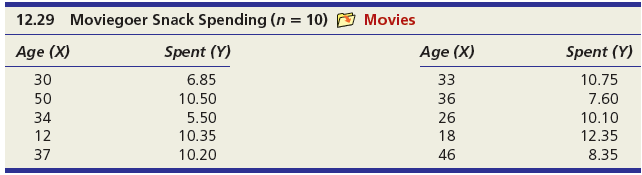 12.29 Moviegoer Snack Spending (n = 10) O Movies Age (X) Spent (Y) Age (X) Spent (Y) 30 6.85 33 10.75 50 10.50 36 7.60 34 5.50 26 10.10 12 10.35 18 12.35 37 10.20 46 8.35