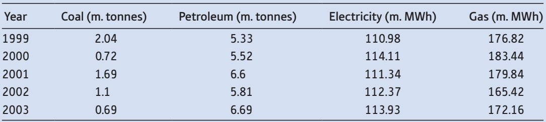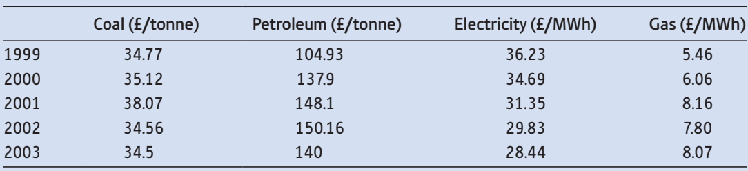 Coal (£/tonne) Petroleum (£/tonne) Electricity (£/MWh) Gas (£/MWh) 1999 34.77 104.93 36.23 5.46 2000 35.12 137.9 34.69 6.06 2001 38.07 148.1 31.35 8.16 2002 34.56 150.16 29.83 7.80 2003 34.5 140 28.44 8.07 Year Coal (m. tonnes) Petroleum (m. tonnes) Electricity (m. MWh) Gas (m. MWh) 1999 2.04 5.33 110.98 176.82 2000 0.72 5.52 114.11 183.44 2001 1.69 6.6 111.34 179.84 2002 1.1 5.81 112.37 165.42 2003 0.69 6.69 113.93 172.16