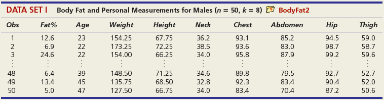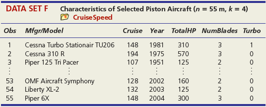 DATA SET A Mileage and Other Characteristics of Randomly Selected Vehicles (n = 73, k = 4) O Mileage Obs Vehicle CityMPG Length Width Weight ManTran 3968 3583 1 Acura TL 20 109.3 108.3 74.0 Audi A5 73.0 71.9 2 22 1 BMW 4 Series 428i 22 182.6 3470 Volkswagen Passat SE Volvo S60 T5 71 24 191.6 72.2 3230 72 21 182.2 73.4 3528 73 Volvo XC90 16 189.3 76.2 4667 DATA SET B Noodles & Company Sales, Seating, and Demographic Data (n = 74, k = 5) O Noodles2 Obs Sales/SqFt Seats-Inside Seats-Patio Medincome MedAge Bach Deg% 1 702 66 18 45.2 34.4 31 2 210 69 16 51.9 41.2 20 365 67 10 51.4 40.3 24 72 340 63 28 60.9 43.5 21 73 401 72 15 73.8 41.6 29 74 327 76 24 64.2 31.4 15 DATA SET C = 32, Assessed Value of Small Medical Office Buildings (n = k = 5) O Assessed Obs Assessed Floor Offices Entrances Age Freeway 1 1796 4790 4 2 8 2 1544 4720 3 2 12 3 2094 5940 4 2 2 30 1264 3580 3 2 27 31 1162 3610 2 1 8 1 32 1447 3960 3 2 17 DATA SET D Changes in Consumer Price Index, Capacity Utilization, Changes in Money Supply Components, and Unemployment (n = 41, k = 4) O Money Year ChgCPI СapUtil ChgM1 ChgM2 Unem 1966 2.9 91.1 2.5 4.6 3.8 1967 3.1 87.2 6.6 9.3 3.8 1968 4.2 87.1 7.7 8.0 3.6 2004 2.7 76.6 5.3 5.8 5.5 2005 3.4 78.8 -0.2 4.0 5.1 2006 3.2 80.4 -0.5 5.3 4.6 co co m m m Ln -6 DATA SET E College Graduation Rate and Selected Characteristics of U.S. States (n = 50, k = 8) D ColGrads State ColGrad% Dropout EdSpend Metro% Age LPRFem Neast Seast West AL 19.8 19.1 1221 89.2 37.4 55.8 1 2187 1137 74.7 33.9 34.5 AK 28.7 8.3 65.6 1 AZ 27.9 14.3 96.7 57.4 15.1 17.6 1538 75.0 40.7 49.1 1 WI 25.1 9.5 1792 85.9 37.9 66.6 WY 22.0 9.1 1896 71.5 39.1 65.3 - ... O O- O oo. OOO DATA SET F Characteristics of Selected Piston Aircraft (n = 55 m, k = 4) O CruiseSpeed Obs Mfgr/Model Cruise Year TotalHP NumBlades Turbo 1 Cessna Turbo Stationair TU206 148 1981 310 3 1 2 Cessna 310 R 194 1975 570 3 3 Piper 125 Tri Pacer 107 1951 125 2 OMF Aircraft Symphony Liberty XL-2 Piper 6X 53 128 2002 160 2 54 132 2003 125 2 55 148 2004 300 3. O O... O O o DATA SET G Characteristics of Randomly Chosen Hydrocarbons (n = 35, k = 7) O Retention Obs Name Ret MW ВР RI H1 H2 H3 H4 2,4,4-trimethyl-2-pentene 153.57 1,5-cyclooctadiene methylcyclohexane 1 112.215 105.06 1.4135 1 2 237.56 108.183 150.27 1.4905 1 3 153.57 98.188 101.08 1.4206 ethylbenzene m-ethyl toluene 3-methylhexane 33 209.700 106.170 136.000 1.4950 34 247.800 120.194 161.480 1.4941 35 132.320 100.204 92.000 1.3861 1 O OF... o C O OO... Oo O O O O... O O DATA SET H 2007 Foreclosure' data-toggle="tooltip" data-placement="top" title="Click to view definition...">Foreclosure Rates (n = 50, k = 7) O Foreclosures2 State Foredosure Masslayoff Subprimeshare PricelncomeRatio Ownership 5YrApp UnempChange %HousMoved 28% 18% Alabama 2.70 5.96 4.04 76.6 32.51 0.00% 0.448 Alaska 4.90 2.78 5.54 66.0 53.91 -4.62% 0.426 Arizona 15.20 1.56 26% 6.79 71.1 96.55 -7.32% 0.383 West Virginia 0.50 1.05 21% 4.34 81.3 35.82 -2.13% 0.502 Wisconsin 4.90 12.50 21% 4.83 71.1 36.37 4.26% 0.428 Wyoming 1.50 0.96 23% 5.06 72.8 62.56 -9.09% 0.498 DATA SET I Body Fat and Personal Measurements for Males (n = 50, k = 8) O BodyFat2 Obs Fat% Age Weight Height Neck Chest Abdomen Hip Thigh 1 12.6 23 154.25 67.75 36.2 93.1 85.2 94.5 59.0 6.9 22 173.25 72.25 38.5 93.6 83.0 98.7 58.7 3 24.6 22 154.00 66.25 34.0 95.8 87.9 99.2 59.6 48 6.4 39 148.50 71.25 34.6 89.8 79.5 92.7 52.7 49 13.4 45 135.75 68.50 32.8 92.3 83.4 90.4 87.2 52.0 50 5.0 47 127.50 66.75 34.0 83.4 70.4 50.6 DATA SET J Used Vehicle Prices (n = 637, k = 4) O Vehicles Obs Model Price Age Car Truck SUV Astro GulfStream Conversion 12,988 5,950 19,995 1 3 Astro LS 4.3L V6 9. Astro LS V6 4. DC 300M Autostick DC 300M Special Edition GM 3500 4x4 w/8ft bed and plow 17,995 635 10,995 22,995 6. 636 1 1 637 5 1 OO O. .. O O O DATA SET K 2009 Summer National Senior Games-500-Yard Freestyle (n = 198, k = 3) D olympics Swim Time Seed Gender Age 371.20 446.29 390.56 391.20 1 51 52 372.28 380.10 50 789.29 795.30 85 883.70 1027.22 1021.20 1074.70 87 86 - -.. 000