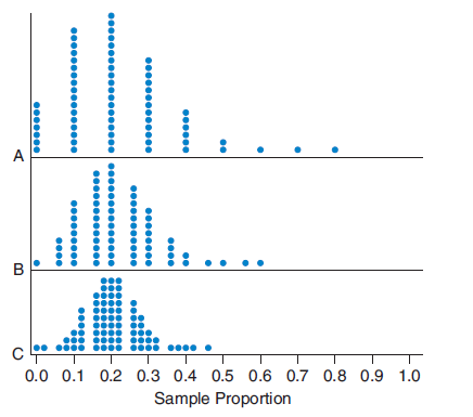 A Zener deck of cards has cards that show one of five different shapes with equal representation, so that the probability of selecting any particular shape is 0.20. A card is selected randomly, and a person is asked to guess which card has been chosen. The graph below shows a computer simulation of experiments in which a âpersonâ was asked to guess which card had been selected for a large number of trials. (If the person does not have ESP, then his or her proportion of successes should be about 0.20, give or take some amount.) Each dot in the dotplots represents the proportion of success for one person. For instance, the dot in Figure A farthest to the right represents a person with an 80% success rate. One dotplot represents an experiment in which each person had 10 trials; another shows 20 trials; and a third shows 40 trials.