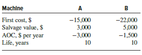 AAA Pest Control uses the following: before-tax MARR = 14% per year, after-tax MARR = 7% per year, and Te = 50%. Two new spray machine options have the following estimates and will generate the same GI each year.