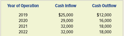 Year of Operation Cash Inflow Cash Outflow 2019 $25,000 $12,000 2020 29,000 16,000 2021 32,000 32,000 18,000 18,000 2022