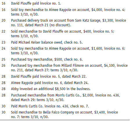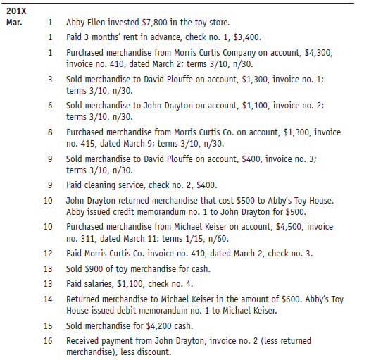 Abby's Toy House Chart of Accounts Assets Revenue 110 Cash 410 Toy Sales 112 Accounts Receivable 412 Sales Returns and Allowances 114 Prepaid Rent 414 Sales Discounts 121 Delivery Truck Cost of Goods Liabilities 510 Toy Purchases 210 Accounts Payable 512 Purchases Returns and Allowances Owner's Equity Purchases Discount 514 310 A. Gray, Capital Еxpenses 610 Salaries Expense 612 Cleaning Expense 201X Mar. Abby Ellen invested $7,800 in the toy store. 1 Paid 3 months' rent in advance, check no. 1, $3,400. Purchased merchandise from Morris Curtis Company on account, $4,300, invoice no. 410, dated March 2; terms 3/10, n/30. 3 Sold merchandise to David Plouffe on account, $1,300, invoice no. 1; terms 3/10, n/30. 6 Sold merchandise to John Drayton on account, $1,100, invoice no. 2; terms 3/10, n/30. 1 8 Purchased merchandise from Morris Curtis Co. on account, $1,300, invoice no. 415, dated March 9; terms 3/10, n/30. Sold merchandise to David Plouffe on account, $400, invoice no. 3; terms 3/10, n/30. 9 Paid cleaning service, check no. 2, $400. John Drayton returned merchandise that cost $500 to Abby's Toy House. Abby issued credit memorandum no. 1 to John Drayton for $500. 10 10 Purchased merchandise from Michael Keiser on account, $4,500, invoice no. 311, dated March 11; terms 1/15, n/60. 12 Paid Morris Curtis Co. invoice no. 410, dated March 2, check no. 3. 13 Sold $900 of toy merchandise for cash. 13 Paid salaries, $1,100, check no. 4. Returned merchandise to Michael Keiser in the amount of $600. Abby's Toy House issued debit memorandum no. 1 to Michael Keiser. 14 15 Sold merchandise for $4,200 cash. Received payment from John Drayton, invoice no. 2 (less returned merchandise), less discount. 16 16 David Plouffe paid invoice no. 1. Sold toy merchandise to Aimee Raypole on account, $4,000, invoice no. 4; terms 3/10, n/30. 16 Purchased delivery truck on account from Sam Katz Garage, $3,300, invoice no. 111, dated March 21 (no discount). 20 22 Sold merchandise to David Plouffe on account, $400, invoice no. 5; terms 3/10, n/30. 23 Paid Michael Keiser balance owed, check no. 5. Sold toy merchandise to Aimee Raypole on account, $1,600, invoice no. 6; terms 3/10, n/30. 24 25 Purchased toy merchandise, $500, check no. 6. Purchased toy merchandise from Millard Filmore on account, $4,100, invoice no. 211, dated March 27; terms 3/10, n/30. 26 28 David Plouffe paid invoice no. 5, dated March 22. 28 Aimee Raypole paid invoice no. 6, dated March 24. 28 Abby invested an additional $8,500 in the business. Purchased merchandise from Morris Curtis Co., $2,000, invoice no. 436, dated March 29; terms 3/10, n/30. 28 30 Paid Morris Curtis Co. invoice no. 436, check no. 7. Sold merchandise to Bella Falco Company on account, $3,400, invoice no. 7; terms 3/10, n/30. 30