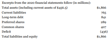 Excerpts from the 2020 financial statements follow (in millions): Total assets (including current assets of $456.5) $1,866 Current liabilities 765 Long-term debt 841 Preferred shares 289 Common shares 407 Deficit (436) Total liabilities and equity $1,866
