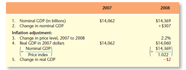 2007 2008 1. Nominal GDP (in billions) 2. Change in nominal GDP $14,062 $14,369 +$307 Inflation adjustment: 3. Change in price level, 2007 to 2008 4. Real GDP in 2007 dollars Nominal GDP Price index 5. Change in real GDP 2.2% $14,060 $14,369 $14,062 1.022 -$2