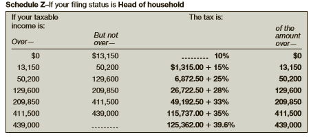 Schedule Z-If your filing status is Head of household The tax is: If your taxable income is: of the amount over- But not Over- over- $0 $13,150 10% $0 13,150 50,200 $1,315.00 + 15% 13,150 50,200 129,600 6,872.50 + 25% 50,200 129,600 209,850 26,722.50 + 28% 129,600 209,850 411,500 49,192.50 + 33% 209,850 411,500 439,000 115,737.00 + 35% 411,500 439,000 125,362.00 + 39.6% 439,000