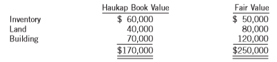 Haukap Book Value $ 60,000 40,000 70,000 $170,000 Fair Value Inventory Land Building $ 50,000 80,000 120,000 $250,000
