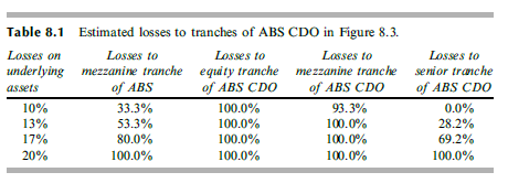 Table 8.1 Estimated losses to tranches of ABS CDO in Figure 8.3. Losses on Losses to Losses to Losses to Losses to underlying mezzanine tranche equity tranche mezzanine tranche of ABS CDO senior tranche of ABS of ABS CDO of ABS CDO assets 10% 93.3% 100.0% 33.3% 100.0% 0.0% 13% 53.3% 100.0% 28.2% 17% 80.0% 100.0% 100.0% 69.2% 20% 100.0% 100.0% 100.0% 100.0%
