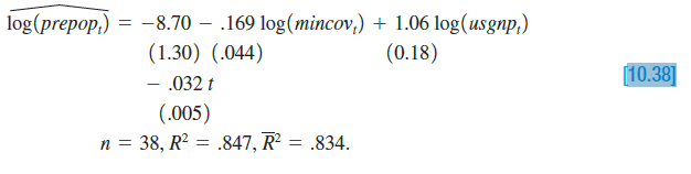Add the variable log( prgnp) to the minimum wage equation in (10.38). Is this variable significant? Interpret the coefficient. How does adding log( prgnp) affect the estimated minimum wage effect?