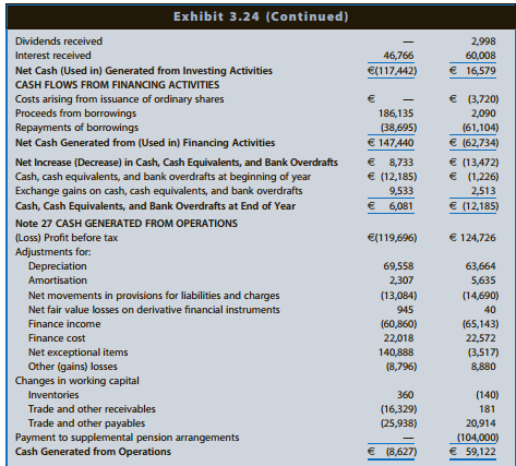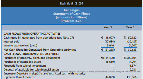 Exhibit 3.24 Aer Lingus Statement of Cash Flows (amounts in millions) (Problem 3.26) Year 2 Year 1 CASH FLOWS FROM OPERATING ACTIVITIES € (8,627) € 59,122 Cash (used in) generated from operations (see Note 27) Interest paid Income tax received (paid) (17,684) (22,437) (4,002) € 32,683 5,046 Net Cash (Used in) Generated from Operating Activities € (21,265) CASH FLOWS FROM INVESTING ACTIVITIES Purchases of property, plant, and equipment Purchases of intangible assets Proceeds from sale of investment €(114,490) €(200,604) (5,619) (4,294) 11,374 Disposal of available-for-sale financial assets 9,031 2018 Cengag Learnigs. Al Riphts Perd. Manot be cogied, scanned, or duplicated, in whole or in part. WCN d2-200-203 greater than 3 months (44,099) 138,066 Exhibit 3.24 (Continued) Dividends received 2,998 Interest received 46,766 60,008 Net Cash (Used in) Generated from Investing Activities €(117,442) € 16,579 CASH FLOWS FROM FINANCING ACTIVITIES € (3,720) Costs arising from issuance of ordinary shares Proceeds from borrowings Repayments of borrowings 186,135 2,090 (38,695) € 147,440 € 8,733 € (12,185) (61,104) Net Cash Generated from (Used in) Financing Activities € (62,734) Net Increase (Decrease) in Cash, Cash Equivalents, and Bank Overdrafts Cash, cash equivalents, and bank overdrafts at beginning of year Exchange gains on cash, cash equivalents, and bank overdrafts € (13,472) € (1,226) 2,513 € (12,185) 9,533 Cash, Cash Equivalents, and Bank Overdrafts at End of Year € 6,081 Note 27 CASH GENERATED FROM OPERATIONS (Loss) Profit before tax €(119,696) € 124,726 Adjustments for: Depreciation 69,558 63,664 Amortisation 2,307 5,635 Net movements in provisions for liabilities and charges (13,084) (14,690) Net fair value losses on derivative financial instruments 945 40 Finance income (60,860) (65,143) Finance cost 22,018 22,572 Net exceptional items Other (gains) losses Changes in working capital 140,888 (3,517) (8,796) 8,880 Inventories 360 (140) Trade and other receivables (16,329) 181 Trade and other payables Payment to supplemental pension arrangements Cash Generated from Operations (25,938) 20,914 (104,000) € 59,122 € (8,627)