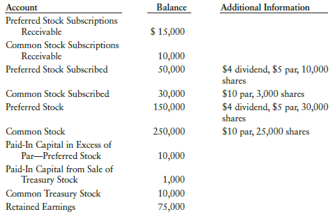 Account Balance Additional Information Preferred Stock Subscriptions Receivable $ 15,000 Common Stock Subscriptions Receivable 10,000 50,000 $4 dividend, $5 par, 10,000 shares Preferred Stock Subscribed 30,000 150,000 $10 par, 3,000 shares $4 dividend, $5 par, 30,000 Common Stock Subscribed Preferred Stock shares Common Stock 2.50,000 $10 par, 25,000 sharcs Paid-In Capital in Excess of Par-Preferred Stock 10,000 Paid-In Capital from Sale of Treasury Stock 1,000 Common Treasury Stock Retained Earnings 10,000 75,000