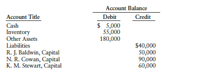 Account Balance Account Title Debit $ 5,000 55,000 180,000 Credit Cash Inventory Other Assets $40,000 50,000 90,000 60,000 Liabilities R. J. Baldwin, Capital N. R. Cowan, Capital K. M. Stewart, Capital