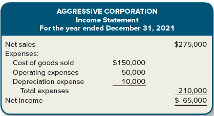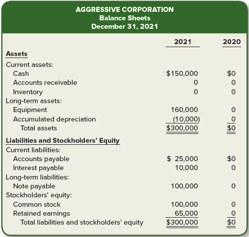 Aggressive Corporation approaches Matt Taylor, a loan officer for Oklahoma State Bank, seeking to increase the companyâs borrowings with the bank from $100,000 to $200,000. Matt has an uneasy feeling as he examines the loan application from Aggressive Corporation, which just completed its first year of operations. The application included the following financial statements.