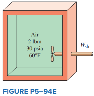 Air in the amount of 2 lbm is contained in a well-insulated, rigid vessel equipped with a stirring paddle wheel. The initial state of this air is 30 psia and 60°F. How much work, in Btu, must be transferred to the air with the paddle wheel to raise the air pressure to 40 psia? Also, what is the final temperature of the air?