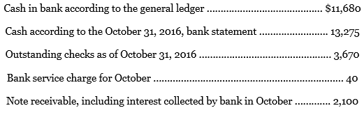 Cash in bank according to the general ledger $11,680 Cash according to the October 31, 2016, bank statement 13,275 Outstanding checks as of October 31, 2016 3,670 Bank service charge for October 40 ..... Note receivable, including interest collected by bank in October .. 2,100